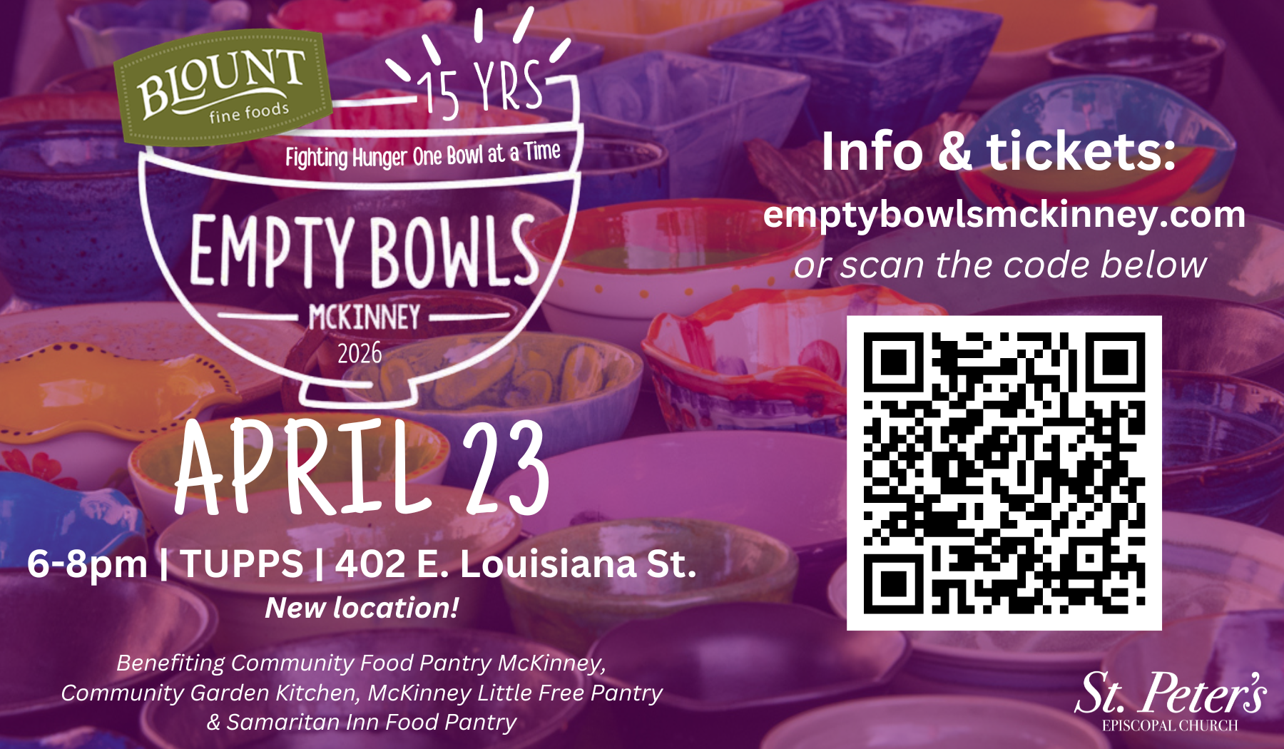 Founded and operated by St. Peter’s, Empty Bowls is an annual event featuring local artists and restaurants to raise funds for hunger relief. Since 2011, it has united art, food, and community to support organizations that feed those in need.